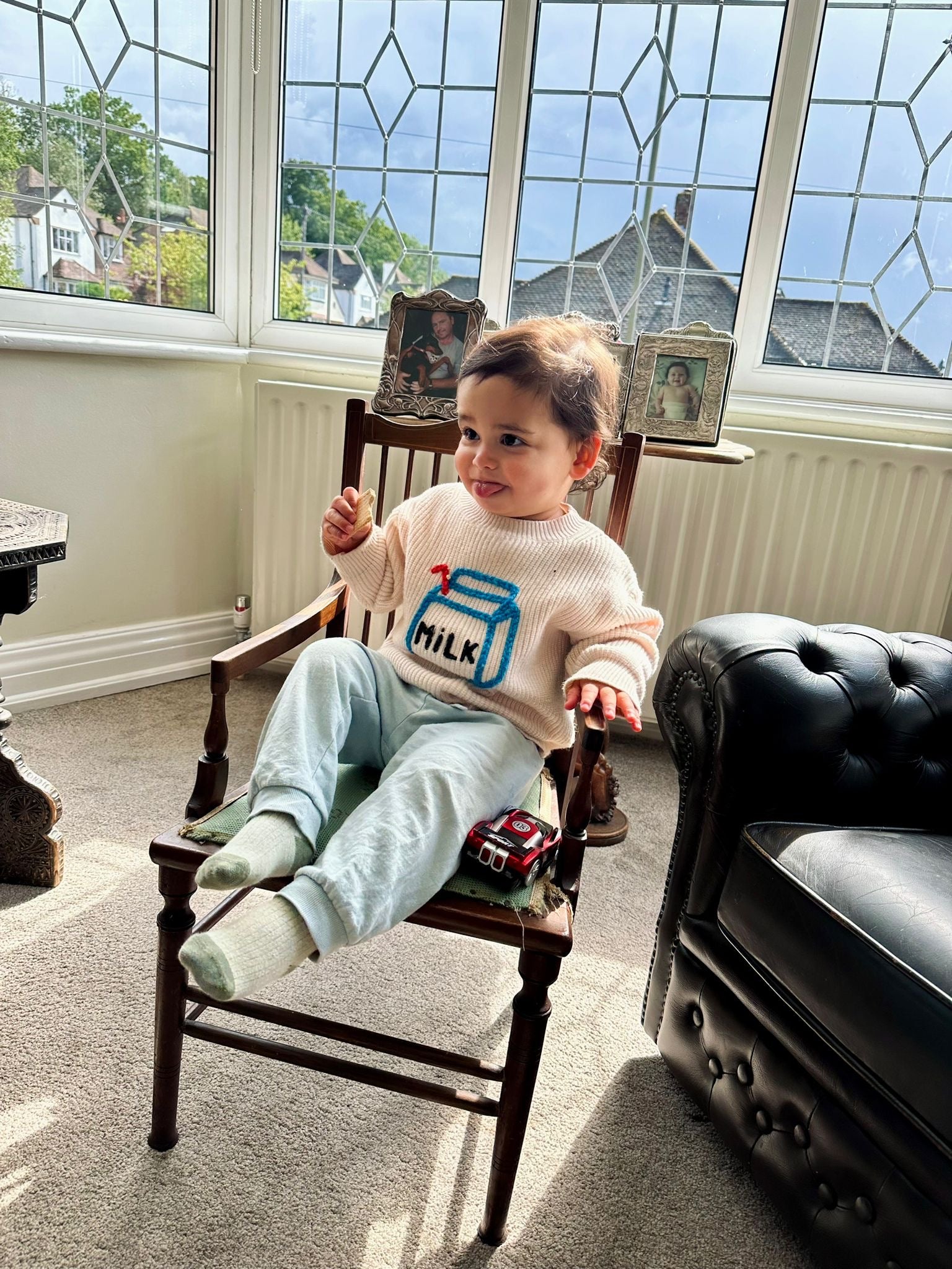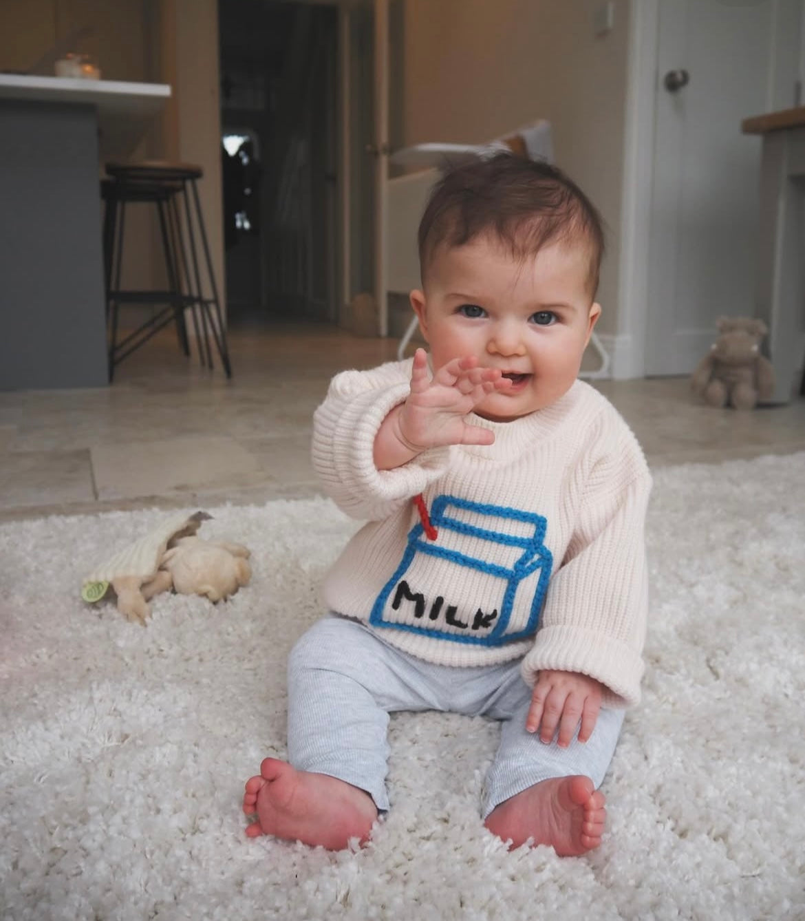 These adorable oversized knit jumpers are perfect for little ones who love comfort and style. Made from soft, high-quality knit fabric, they feature a playful embroidered milk carton design in blue, black and red, adding a fun quirky touch. The relaxed, slouchy fit allows for easy movement and extra cosiness, making them ideal for layering or wearing on their own. With a neutral cream base, these jumpers have a timeless, gender-neutral appeal that pairs effortlessly with any outfit. Perfect for both lounging and outings, they bring a cute and trendy aesthetic to children's wardrobes.